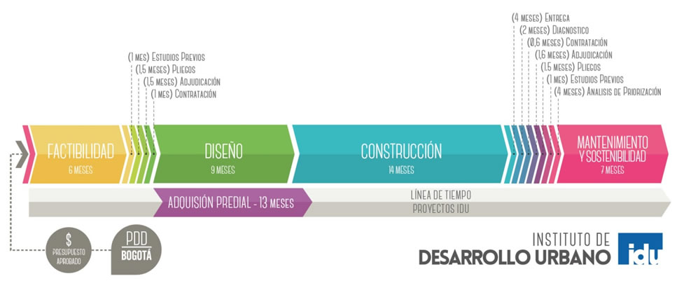 En este contexto es importante aclarar, nuevamente a la opinión pública las etapas y tiempos que el IDU requiere para el desarrollo de los proyectos de infraestructura, como lo muestra la siguiente gráfica: